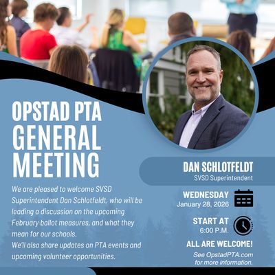 Join us for our next Opstad PTA General Meeting on Wednesday, January 28 at 6:00 p.m. in the school library.